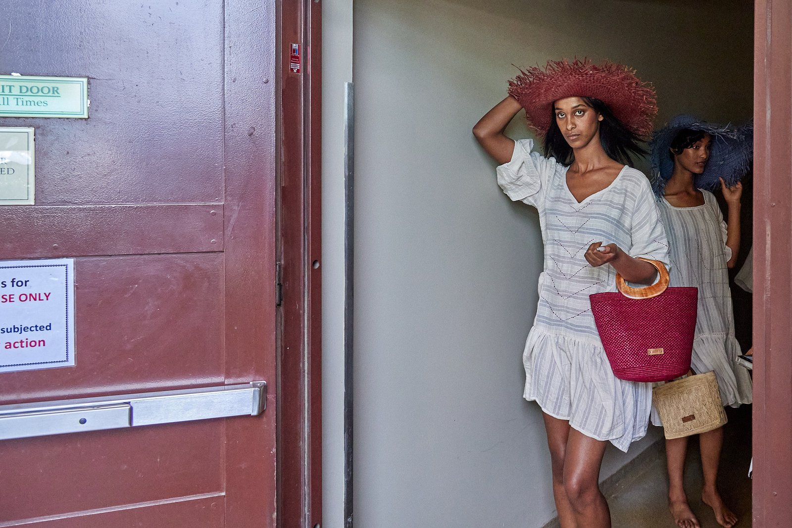 Backstage, models waited in a narrow passage. Light fell from the doorway. A quick check on bags, hats, and timing. A door opened, and the next look stepped forward.